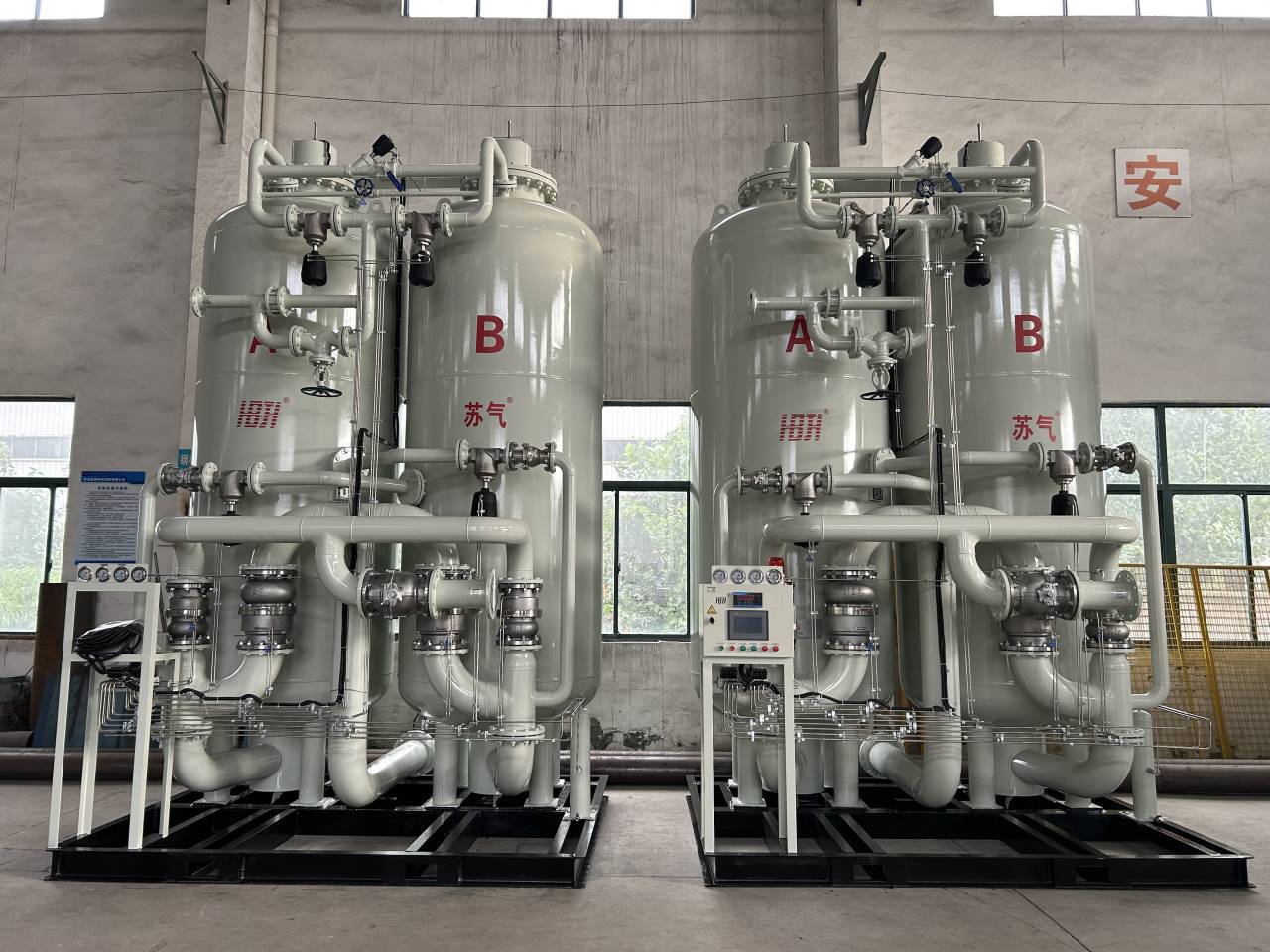 環(huán)境空氣經(jīng)壓縮凈化,除去油、水、塵后,進(jìn)入由兩個裝填有碳分子篩的吸附塔組成的變壓吸附裝置。壓縮空氣由下至上流經(jīng)吸附 塔,其間氧分子在碳分子篩表面吸附,氮氣由吸附塔上端流出,進(jìn)入粗氮緩沖罐,經(jīng)過一段時間后,吸附塔中碳分子篩被吸附的氧飽和,需進(jìn)行再生。再生是通過停止吸附步驟,降低吸附塔壓力來實現(xiàn)的。兩個吸附塔交替進(jìn)行吸附和再生,從而確保氮氣的連續(xù)輸出。
